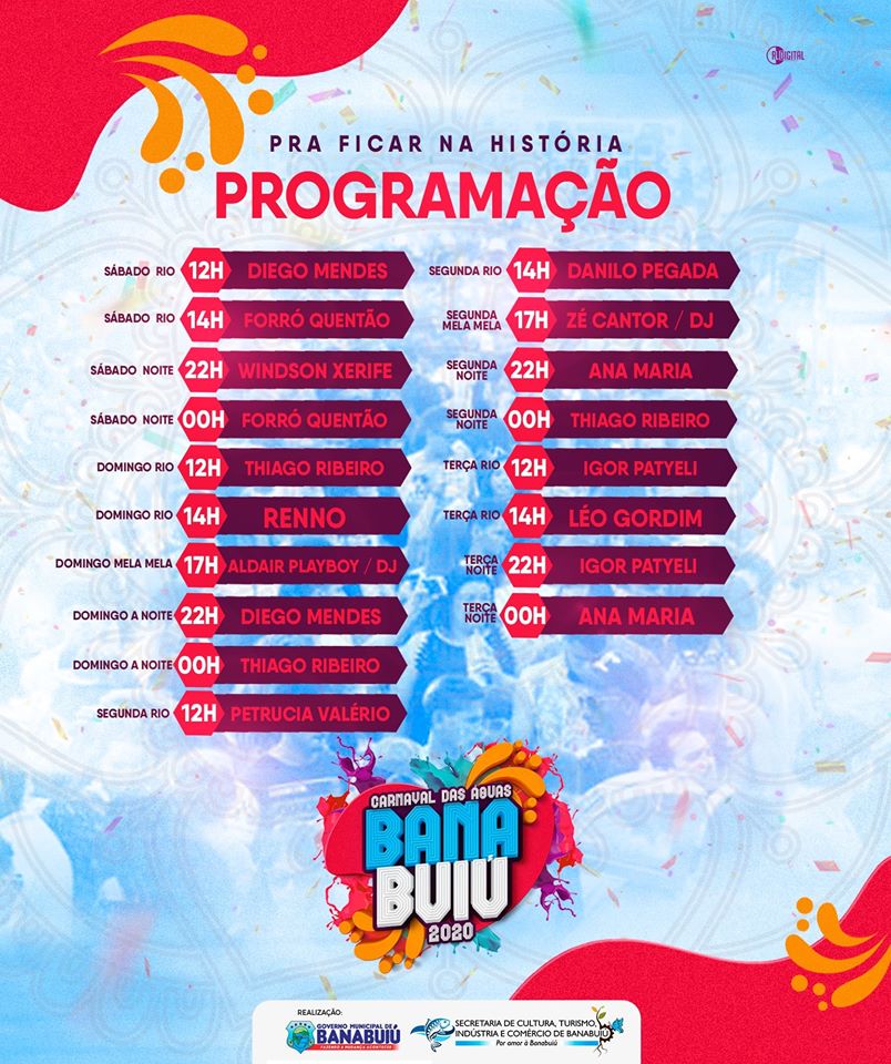 A Prefeitura de Banabuiú divulgou nesta segunda-feira (17) os dias, horários e locais de apresentação de cada banda durante os quatro dias do tradicional Carnaval das Águas realizado naquele município.