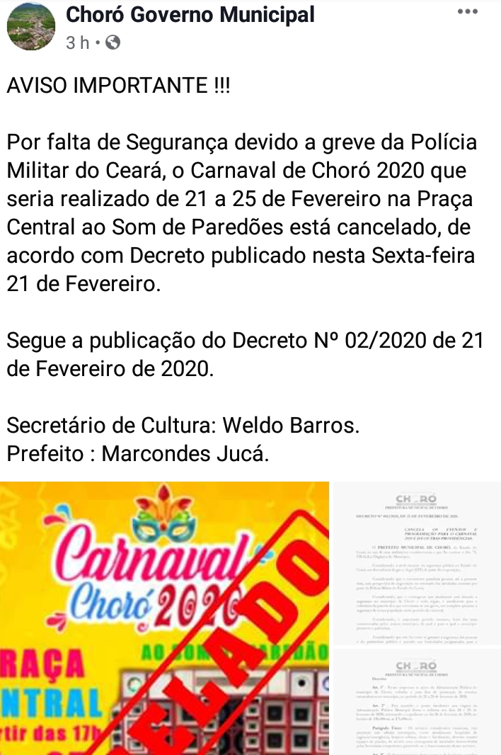 A Prefeitura de Choró no Sertão Central cearense foi mais uma a decidir pelo cancelamento dos festejos de carnaval no ano de 2020 devido a falta de segurança ocasionada pela greve da Polícia Militar no estado do Ceará.