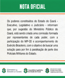 Segundo a nota, os poderes constituídos do Estado do Ceará – Executivo, Legislativo e Judiciário – informam que, por sugestão do Ministério Público do Ceará, está sendo criada uma comissão formada por representantes de cada poder, com a participação do MP-CE e acompanhamento do Exército, com o objetivo de buscar uma solução para por fim à paralisação de parte dos Policiais Militares do estado.