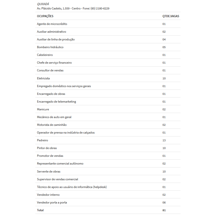 Para Quixadá as vagas disponíveis são para manicure, pedreiro, servente de obras, vendedor interno, dentre outras. Os interessados em uma das vagas apresentadas na lista deverá se dirigir a unidade do Sine/IDT que em Quixadá fica localizada no Terminal Rodoviário.