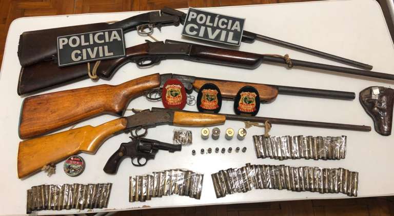 Já na manhã desta quinta-feira (05) no distrito de São Miguel, os policiais conseguiram apreender 01 escopeta cal.12, além de 02 revólveres cal.38, além de 35 munições dos referidos calibres. O acusado que estava na posse das armas de fogo foi conduzido e autuado em flagrante por posse irregular de arma de fogo.