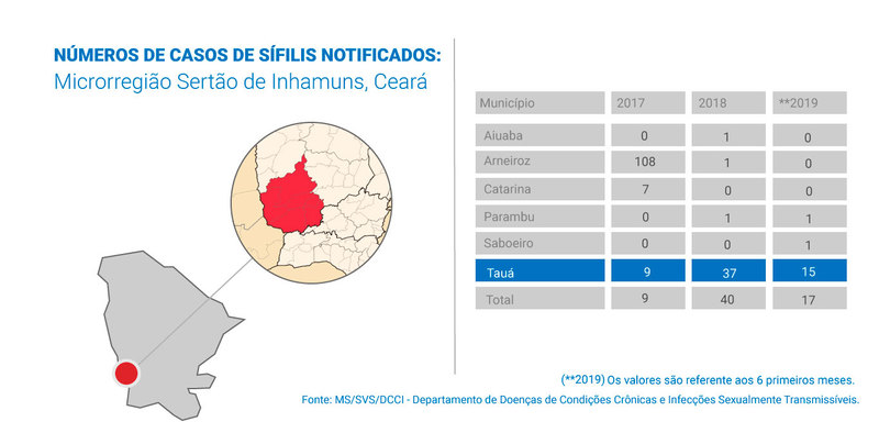 Na microrregião do Sertão dos Inhamuns, por exemplo, onde estão os municípios de Tauá, Catarina, Parambu e outras três cidades cearenses, as infecções por sífilis entre a população tiveram aumento de 138%, em apenas um ano, de 2017 a 2018. Apenas nos seis primeiros meses de 2019, a sífilis infectou 44 pessoas na região. Os dados são do DataSUS.