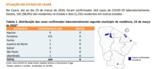 A Secretária de Saúde do Estado do Ceará divulgou no final da tarde desta segunda-feira (23) o boletim epidemiológico que informa que somam 164 casos confirmados da COVID-19 no Ceará. Em relação ao boletim divulgado neste domingo foram 39 casos a mais.