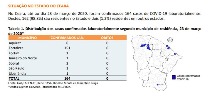 A Secretária de Saúde do Estado do Ceará divulgou no final da tarde desta segunda-feira (23) o boletim epidemiológico que informa que somam 164 casos confirmados da COVID-19 no Ceará. Em relação ao boletim divulgado neste domingo foram 39 casos a mais.