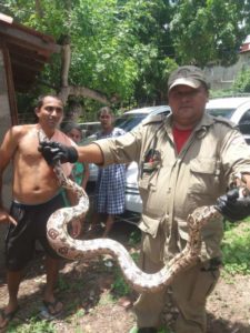 Uma guarnição do Corpo de Bombeiros Militar do Estado do Ceará capturou uma cobra do tipo jiboia de 2 metros de comprimento, na manhã desta segunda-feira (23). O animal foi encontrado na rodovia CE 356, quilômetro 28, na localidade do Sítio Belém, município de Baturité.