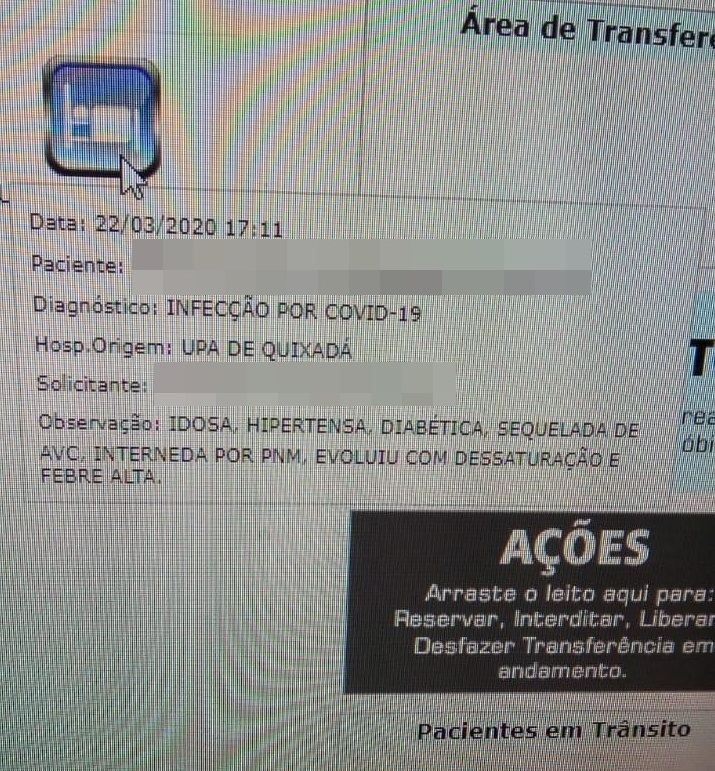 De acordo com a imagem, a paciente estaria na Unidade de Pronto Atendimento (UPA) de Quixadá e pertenceria ao grupo de risco, pois trata-se de uma senhora de 69 anos e com histórico que pode, com a demora da realização do exame, agravar o quadro clínico. A idosa é hipertensa, diabética, com sequela de Acidente Vascular Cerebral (AVC) e estava com febre alta. De acordo com a imagem, o registro da situação da senhora foi feito as 17h11min, do domingo (22) e pode tratar-se do pedido de uma vaga em uma Unidade de Terapia Intensiva (UTI).