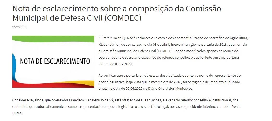 Contudo, nas edições do Diário Oficial dos Municípios dos dias 06, 07, 08 e 09 de abril não foi encontrada a portaria citada pela prefeitura municipal de Quixadá na nota de esclarecimento sobre o assunto. De fato, a única publicação oficial, até o momento, sobre a composição da Comissão Municipal de Defesa Civil é a do dia 03 de abril na qual consta o nome de Ivan Construções como representante da Câmara Municipal no conselho comunitário.