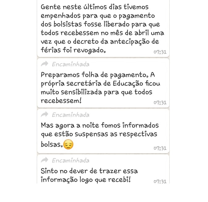 Os cuidadores, porém, afirmam que foram informados de que o serviço já está suspenso a partir de abril. “Gente, neste últimos dias tivemos empenhados para que o pagamento dos bolsistas fosse liberado para que todos recebessem no mês de abril uma vez que o decreto da antecipação de férias foi revogado. Preparamos folha de pagamento. A própria secretária de Educação ficou muito sensibilizada para que todos recebessem! Mas agora a noite fomos informado que estão suspensas as respectivas bolsas”, revela print de uma conversa entre os cuidadores.