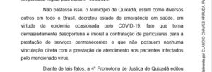 O que causa indignação aos quixadaenses é ver que em um momento tão difícil vivenciado no mundo inteiro, por conta da pandemia do coronavírus, o prefeito tenta se aproveitar da situação, ao tentar contratar apoiadores políticos utilizando a máquina pública em benefício próprio. Entretanto, o Ministério Público desta comarca demonstrou que está agindo em defesa do interesse público dos quixadaenses.