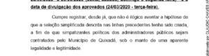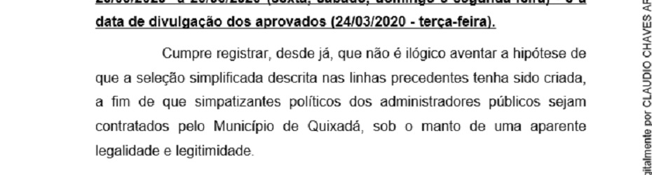 O promotor de justiça Cláudio Chaves de Arruda destacou que “Cumpre registrar, desde já, que não é ilógico aventar a hipótese de que a seleção simplificada descrita na linhas precedentes tenha sido criada, a fim de que simpatizantes políticos dos administradores públicos sejam contratados pelo Município de Quixadá, sob o manto de uma aparente legalidade e legitimidade”.
