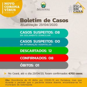Em Solonópole, ainda existem 8 casos confirmados, 8 casos suspeitos em isolamento domiciliar e 12 casos descartados.