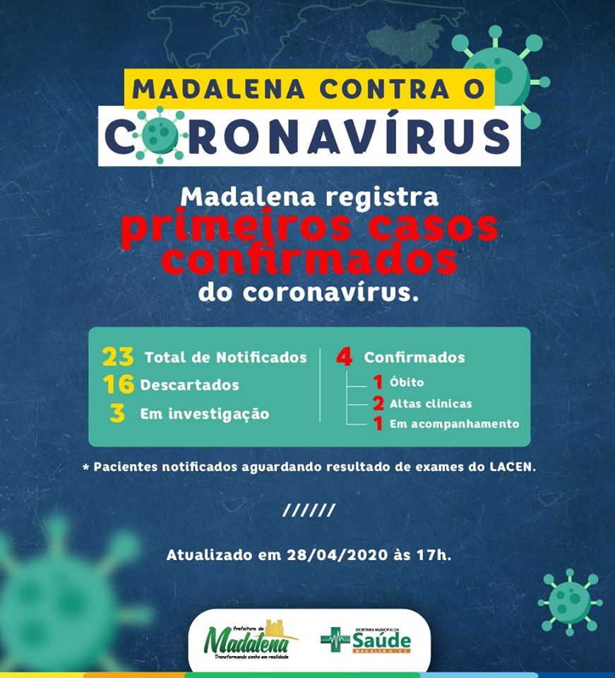 Subiram para quatro o número de casos de coronavírus no município de Madalena, de acordo com o último boletim epidemiológico divulgado pela Secretaria municipal de saúde.