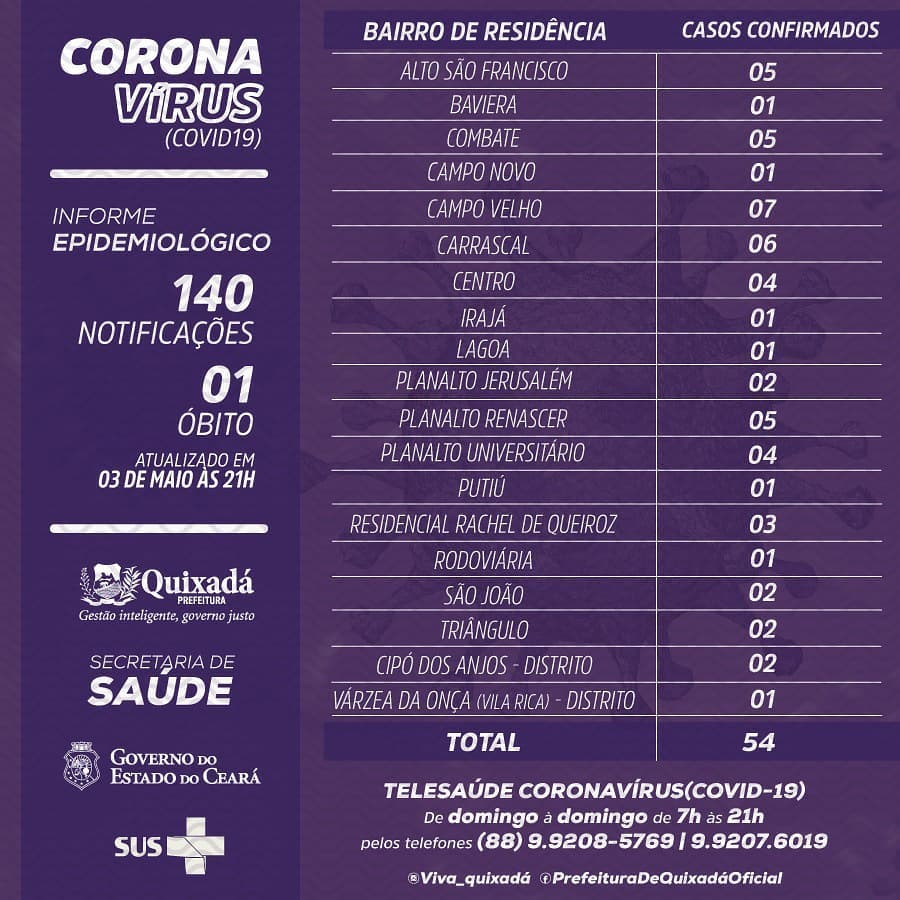 O município de Quixadá registrou 2 novos casos neste domingo (03) e chegou aos 54 o número de infectados pelo novo coronavírus, de acordo com a Secretaria de Saúde do município.