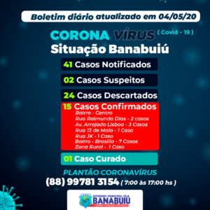 O município de Banabuiú registrou sete novos casos de COVID-19 somente nesta segunda-feira (04) e desta forma o número de infectados pelo vírus na cidade saltou de 8 para 15, segundo boletim epidemiológico divulgado pela Secretaria de Saúde do município.