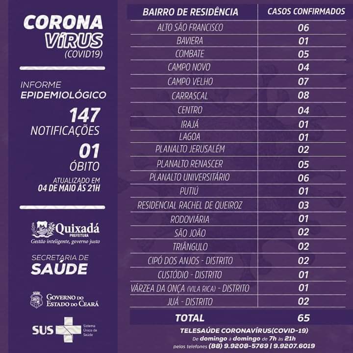 O município de Quixadá confirmou 11 novos casos de coronavírus nesta segunda-feira (04) e desta forma o número de infectados passou de 54 para 65 entre ontem e hoje.