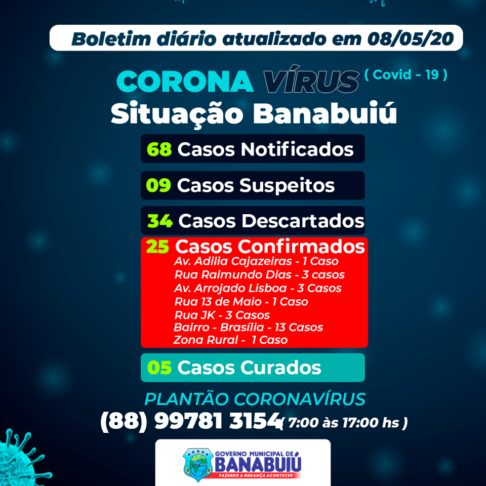 O município de Banabuiú atualizou seu boletim epidemiológico da COVID-19 no final da tarde desta sexta-feira (08) e confirmou três novos casos de COVID-19 no município.