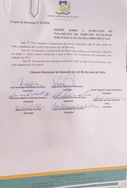 Tendo em vista ações que diminuam o impacto na vida dos munícipes, os vereadores do município de Quixadá, Cabo Marlim, Carlos Eduardo Moreira (Dudu), César Augusto, Evaristo Oliveira, Louro da Juatama, Luiz do Hospital, Marcelo Ventura e Professor Damasceno, propuseram ao prefeito Ilário Marques (PT), na última quarta-feira (6), um Projeto de Indicação, o de nº 02/2020, que tem por objetivo suspender por 90 dias o pagamento de tributos municipais.