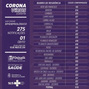 Outro dado que deve ser observado é que pelo menos 43 dos 111 casos já registrados se concentram em apenas quatro bairros, são eles: Campo Velho (12), Centro (11), Alto São Francisco e Carrascal com 10 casos cada. Outros bairros que também preocupam são Planalto Renascer (9) e Planalto Universitário com 8 casos. Somente esses seis bairros registram mais da metade dos casos de coronavírus de Quixadá.