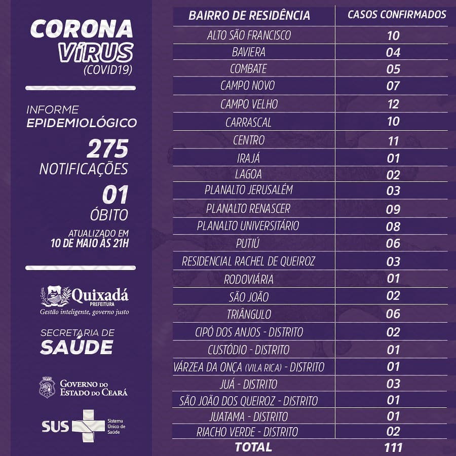De acordo com o último boletim epidemiológico divulgado pela Secretaria de Saúde de Quixadá, já são 111 casos confirmados com 62 pacientes recuperados, 48 em monitoramento, sendo 5 internados e outros 30 aguardando o resultado de seus exames, além de 01 óbito.