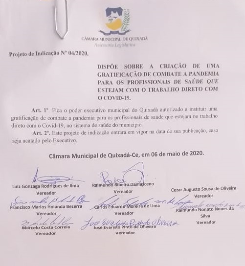 A Câmara Municipal de Quixadá, através de um Projeto de Indicação dos vereadores Cabo Marlim, Carlos Eduardo Moreira (Dudu), César Augusto, Louro da Juatama, Luiz do Hospital, Marcelo Ventura e Professor Damasceno, está propondo ao prefeito Ilário Marques (PT) a criação de uma gratificação de combate a pandemia para os profissionais de Saúde que estejam na linha de frente no serviço público ofertado às pessoas infectadas e com suspeita de contágio da COVID-19.