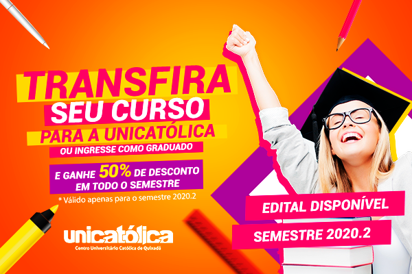 Por meio da “Campanha de Ingresso em 2020.2 de alunos novatos nas modalidades Transferência Externa e Graduados”, a UNICATÓLICA concede benefício especial referente à 50% em todo o semestre de 2020.2 para os alunos transferidos de outras instituições ou ingressando como graduados.
