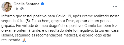 A primeira dama afirmou que está vem, apesar de apresentar sintomas gripais: “Estou bem, graças a Deus, apesar de um pouco gripada.”, escreveu a primeira-dama do estado. Onélia Santana cumpre o período de isolamento social determinado por sua equipe médica.