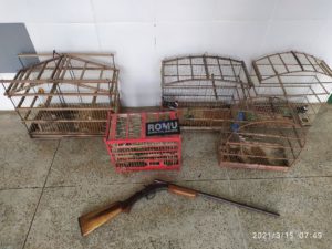 Segundo informações da Guarda Civil Municipal, por volta de 6h30min os Guardas Civis receberam uma denúncia anônima informando que um indivíduo suspostamente embriagado estaria em posse de uma arma de fogo efetuando disparos e ameaçando populares na localidade de Sítio Pau d’água. De imediato, os Guardas Civis se deslocaram ao local e passaram a diligenciar em busca do suspeito. O mesmo foi localizado e negou ter em sua posse qualquer arma de fogo, no entanto, após vistoria no local foi encontrado em cima do guarda roupas uma espingarda cartucheira calibre .32 com um cartucho deflagrado. No alpendre e no interior da residência foram localizados vários pássaros da fauna brasileira presos em gaiolas.