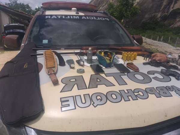 De posse das informações, os policiais militares foram até o local para constatar os fatos. No imóvel do suspeito de alcunha “BIN”, os agentes de segurança foram recebidos por uma moradora que autorizou a entrada dos PMs. No quarto do suspeito, que não foi localizado, a equipe apreendeu o seguinte material: duas espingardas calibres 28 e 20; um revólver calibre 38 e 50 munições.