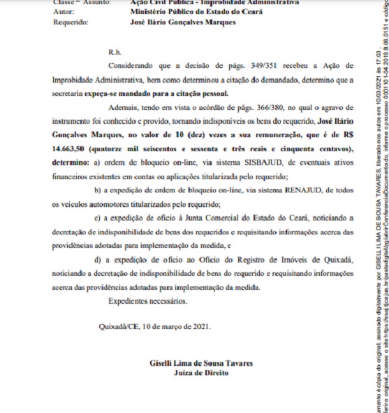 No último dia 10 de março, a Juiza da 1ª Vara Cível da Comarca de Quixadá, Dra. Giselli Lima de Sousa Tavares, expediu uma decisão de ordem de bloqueio dos bens, móveis e imóveis, do petista. “Ademais, tendo em vista o acórdão de págs. 366/380, no qual o agravo de instrumento foi conhecido e provido, tornando indisponíveis os bens do requerido, José Ilário Gonçalves Marques, no valor de 10 (dez) vezes a sua remuneração, que é de R$ 14.663,50 (quatorze mil seiscentos e sessenta e três reais e cinquenta centavos)”.