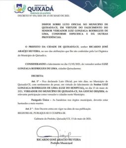 O município de Quixadá decretou luto oficial de três dias devido ao falecimento do vereador Luiz Gonzaga Rodrigues de Lima, o Luiz do Hospital, ocorrida nesta quinta-feira (13) no Hospital Regional do Sertão Central, em Quixeramobim, devido a complicações ocasionadas pela COVID-19.
