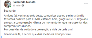 “Amigos (a), venho através deste, comunicar que eu e minha família testamos positivo para COVID, estamos bem, graças a Deus! Peço aos amigos a compreensão diante do momento ter que me ausentar dos compromissos diários”, anunciou Louro da Juatama.