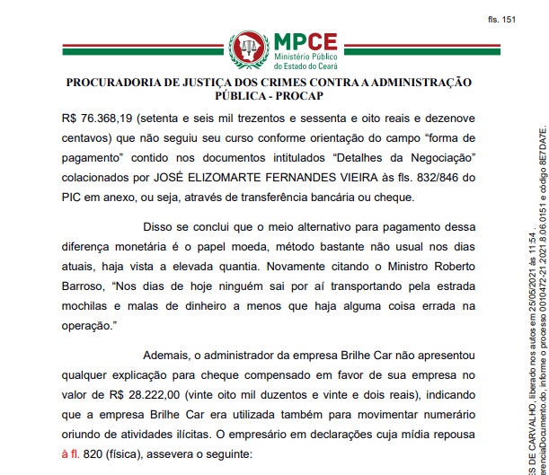 Em outro trecho da denúncia os procuradores relatam que “Ademais, o administrador da empresa não apresentou qualquer explicação para cheque compensado em favor de sua empresa …, indicando que a empresa era utilizada também para movimentação oriundo de atividades ilícitas”, diz a denúncia.