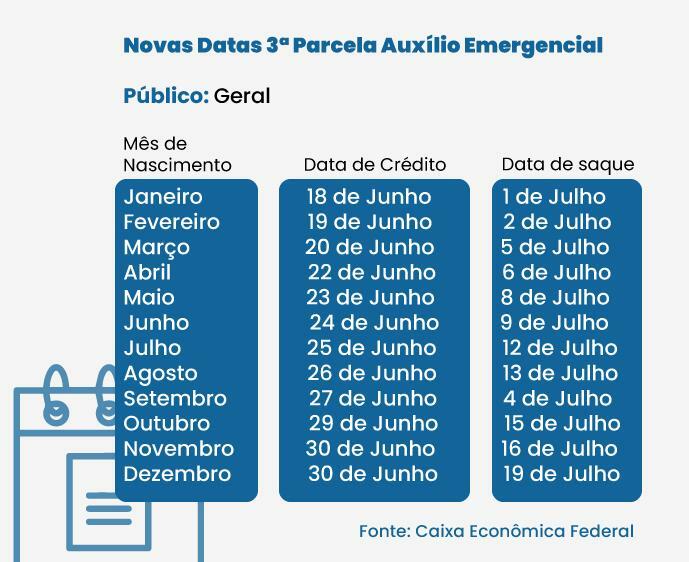 Os pagamentos da terceira parcela do Auxílio Emergencial 2021 foram antecipados pelo governo federal. Os depósitos começam nesta sexta-feira (18), de acordo com o mês de nascimento do beneficiário, e os saques em dinheiro serão liberados a partir do dia 1º de julho. As novas datas foram anunciadas durante coletiva de imprensa realizada pela Caixa nesta terça (15).