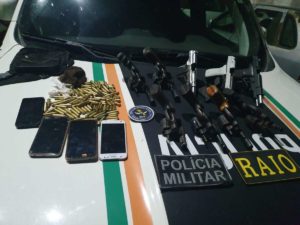 Em ato contínuo, as composições se deslocaram para um imóvel e montaram um cerco policial. Nessa primeira frente, os PMs capturaram três indivíduos e apreenderam uma pistola 380 e dois revólveres calibre 38, municiados. Ainda em diligência, os agentes foram em um segundo endereço. No quintal de uma residência, os policiais localizaram um homem caído ao chão, lesionado a bala. Ao lado dele, foi encontrado um revólver calibre 38. O homem foi levado para uma unidade de saúde. Na terceira frente contra os suspeitos, quatro homens que estavam escondidos em um outro endereço se renderam após o cerco policial. Com eles, foram apreendidas duas pistolas e dois revólveres calibre 38.