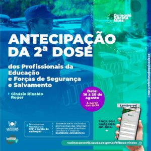 A secretaria de saúde de Quixadá anunciou na noite desta quinta-feira (12) que vai antecipar a segunda dose da vacina contra COVID-19 para profissionais da educação além de forças de segurança e salvamento que tomaram a primeira dose do imunizante da AstraZeneca. Aplicações de 1ª dose e 2ª dose de outros imunizantes não serão antecipadas.