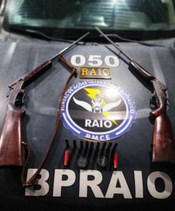 Na tarde deste domingo, 22, equipe do Comando de Policiamento de Rondas de Ações Intensivas e Ostensivas da Polícia Militar do Ceará (CPRAIO/ PMCE) apreendeu duas espingardas calibre .36, 10 cartuchos intactos e um deflagrado em Mombaça, após denúncia.