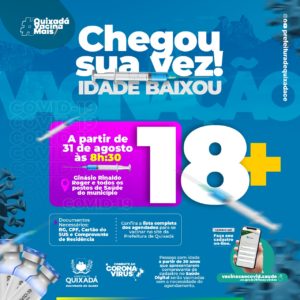 O município de Quixadá deverá concluir ainda essa semana, a vacinação contra a COVID-19 de toda a população adulta. Nesta terça-feira (31), jovens com idades a partir de 18 anos, começarão a ser vacinados tanto no Ginásio Rinaldo Roger como em todos os postos de saúde do município. A informação foi divulgada ainda no último sábado (28) pela prefeitura através de suas redes sociais.