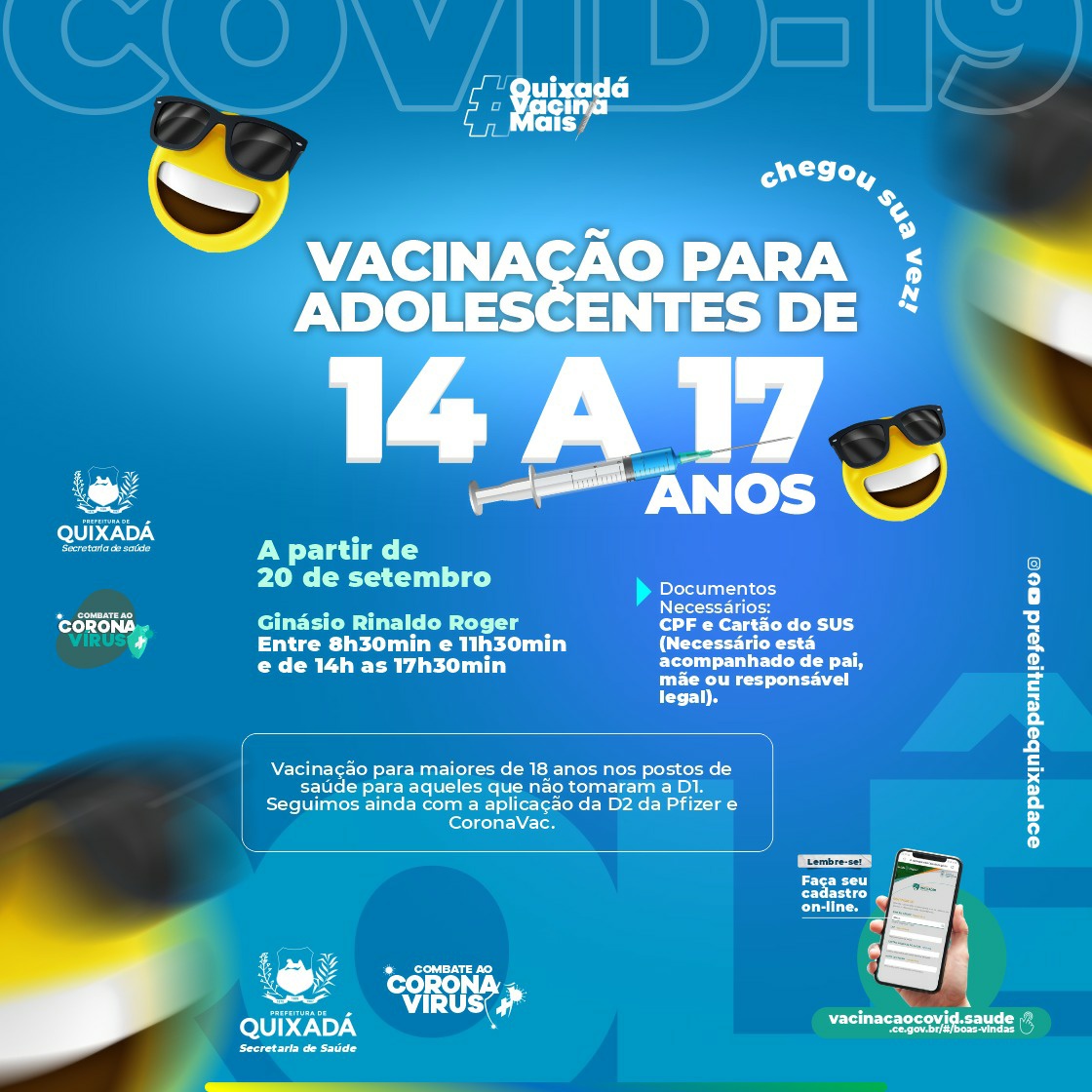 O município de Quixadá deu início nessa segunda-feira (20) a vacinação de adolescentes a partir de 14 anos. Na última semana, já havia tido início o atendimento de adolescentes de 16 e 17 anos, e agora duas novas faixas etárias começaram a ser vacinadas exclusivamente no ginásio Rinaldo Roger, entre 8h30min e 11h30min e das 14h as 17h30min.
