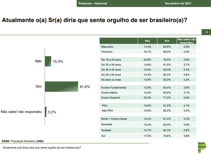Um levantamento realizado pelo Instituto Paraná Pesquisas revelou que 81,6% dos entrevistados sentem orgulho de ser brasileiros. Já outros 15,3% disseram que não sentem orgulho.
