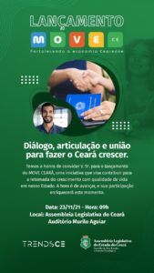 A Assembleia Legislativa realiza nesta terça-feira (23), em parceria com a plataforma TrendsCE, o lançamento do MOVE CE, iniciativa que promoverá diálogos e articulações que visam fortalecer a economia cearense e contribuir para a retomada do crescimento com geração de emprego e renda. O evento será às 9 horas, no auditório Murilo Aguiar, com transmissão ao vivo pelo Youtube da TV Assembleia. Antes, às 8h30min, haverá coletiva de imprensa no local.