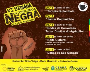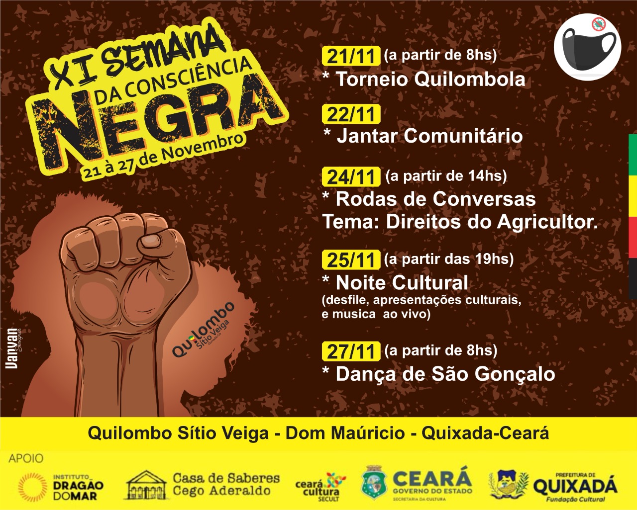 A XI Semana da Consciência Negra da Comunidade Quilombola do Sítio Veiga, conta com total apoio da Prefeitura de Quixadá através da Fundação Cultural, Governo do Estado, Secult, Instituto Dragão do Mar e Casa de Saberes Cego Aderaldo.