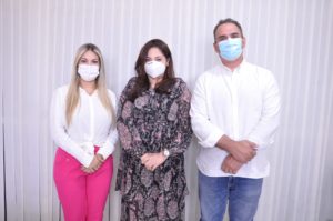 Da esquerda para a direita: Iáskara Silveira, primeira-dama; Lady Arruda Mota, nova secretária de saúde de Quixadá, e Ricardo Silveira, prefeito (Foto: Márcio Guedes)