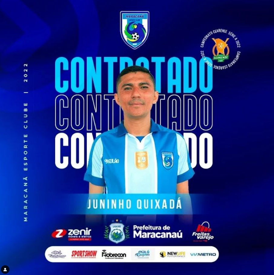O experiente atacante Juninho Quixadá, de 36 anos de idade com passagens por Ceará, Ferroviário, Bragantino, ABC e atuação no futebol europeu, onde atuou por muitos anos no futebol Búlgaro, é o novo reforço do Maracanã, de Maracanaú, para as disputas do Campeonato Cearense 2022. A contratação do atleta foi anunciada pelo clube no último sábado (08).