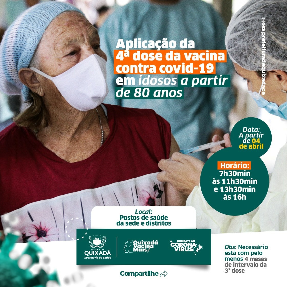 O município de Quixadá inicia a partir da próxima segunda-feira (04) nos postos de saúde da sede e distritos, a aplicação da 4ª dose da vacina em idosos a partir de 80 anos que estejam com pelo menos 4 meses de intervalo da 3ª dose. O anúncio foi feito pela prefeitura através de suas redes sociais na tarde dessa sexta-feira (01).
