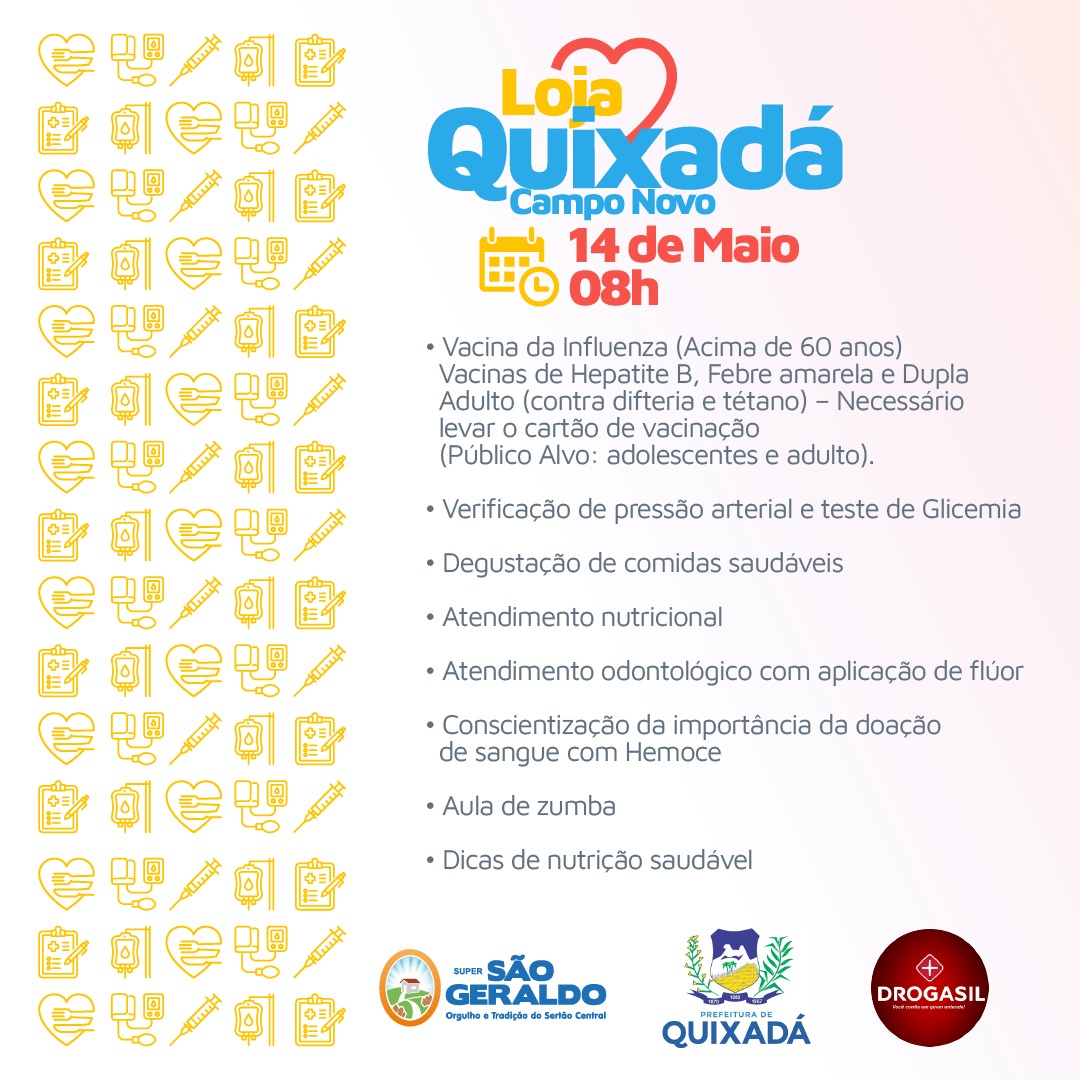 Uma ação conjunta entre o Super São Geraldo, a prefeitura de Quixadá e a Drogasil vai levar diversos serviços aos moradores dos bairros Campo Novo e imediações no próximo sábado (14). A ação acontece a partir das 8h na loja do grupo São Geraldo do bairro Campo Novo.