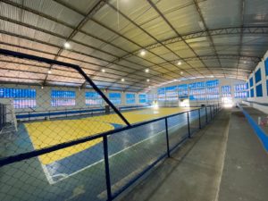 A reforma contempla a substituição de toda a iluminação por lâmpadas LED, toda a pintura interna e externa, inclusive do piso da quadra, manutenção e substituição do telhado danificado, manutenção hidráulica e elétrica, além da substituição de traves, suportes, alambrados e outros equipamentos para a prática desportiva.