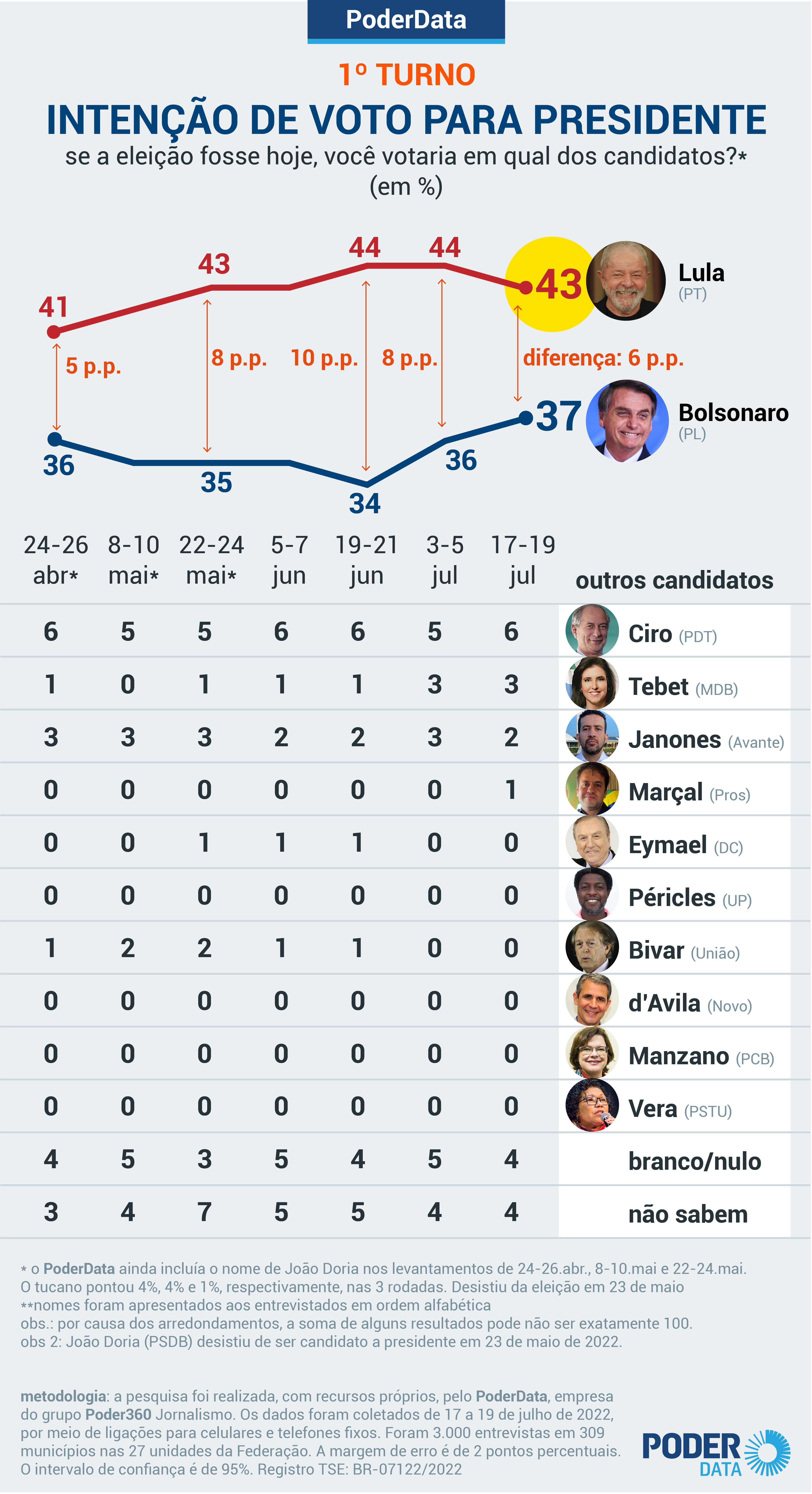 A pesquisa PoderData foi realizada de 17 a 19 de julho de 2022. Foram entrevistadas 3.000 pessoas com 16 anos de idade ou mais em 309 municípios nas 27 unidades da Federação. Foi aplicada uma ponderação paramétrica para compensar desproporcionalidades nas variáveis de sexo, idade, grau de instrução, região e renda. A margem de erro é de 2 pontos percentuais, para mais ou para menos. A pesquisa está registrada no TSE sob o número BR-07122/2022.