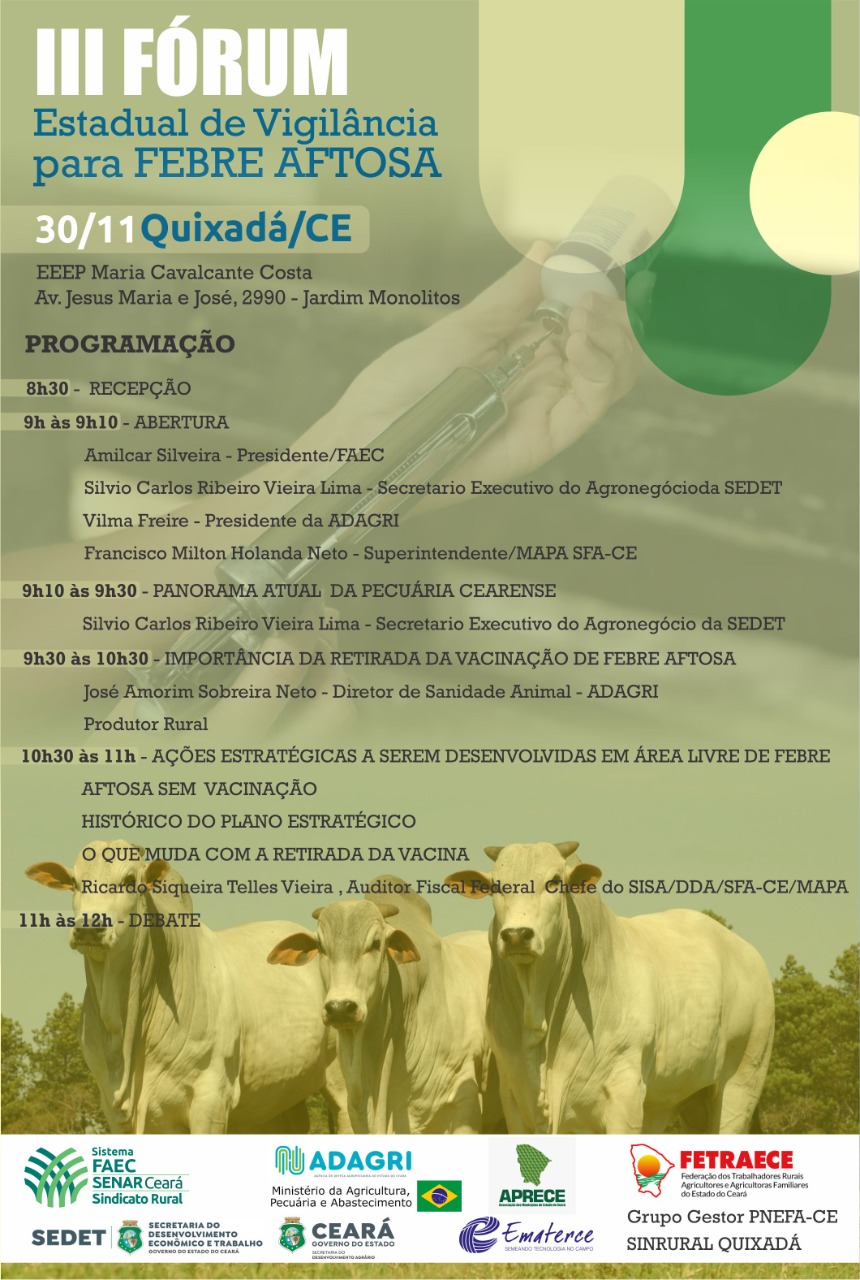 A Federação da Agricultura e Pecuária do Estado do Ceará – FAEC e o Sindicato Rural de Quixadá realizam nesta quarta-feira (30) a partir das 8h30min na Escola de Ensino Profissionalizante Maria Cavalcante Costa, o III Fórum Estadual de Vigilância para Febre Aftosa.