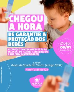 Dessa vez o público-alvo da vacinação serão as crianças de 6 meses a menores de 1 ano de idade, sem comorbidades. A vacina aplicada será a Pfizer Baby e a vacinação acontecerá no Posto de Saúde do Centro (Antigo SESP), entre 8h e 12h. Não é necessário agendamento prévio.