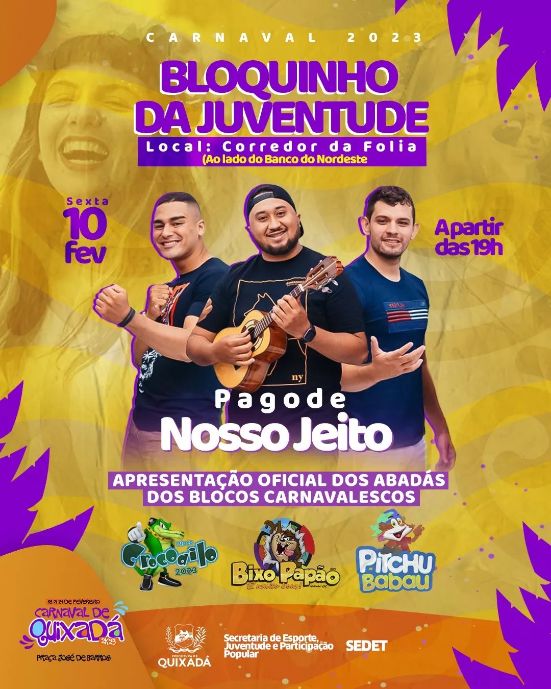 Animando a festa tem ainda um show com a banda Nosso Jeito, fazendo o esquenta do Carnaval de Quixadá com um repertório elétrico de muito axé, e uma apresentação especial do Grupo Império.